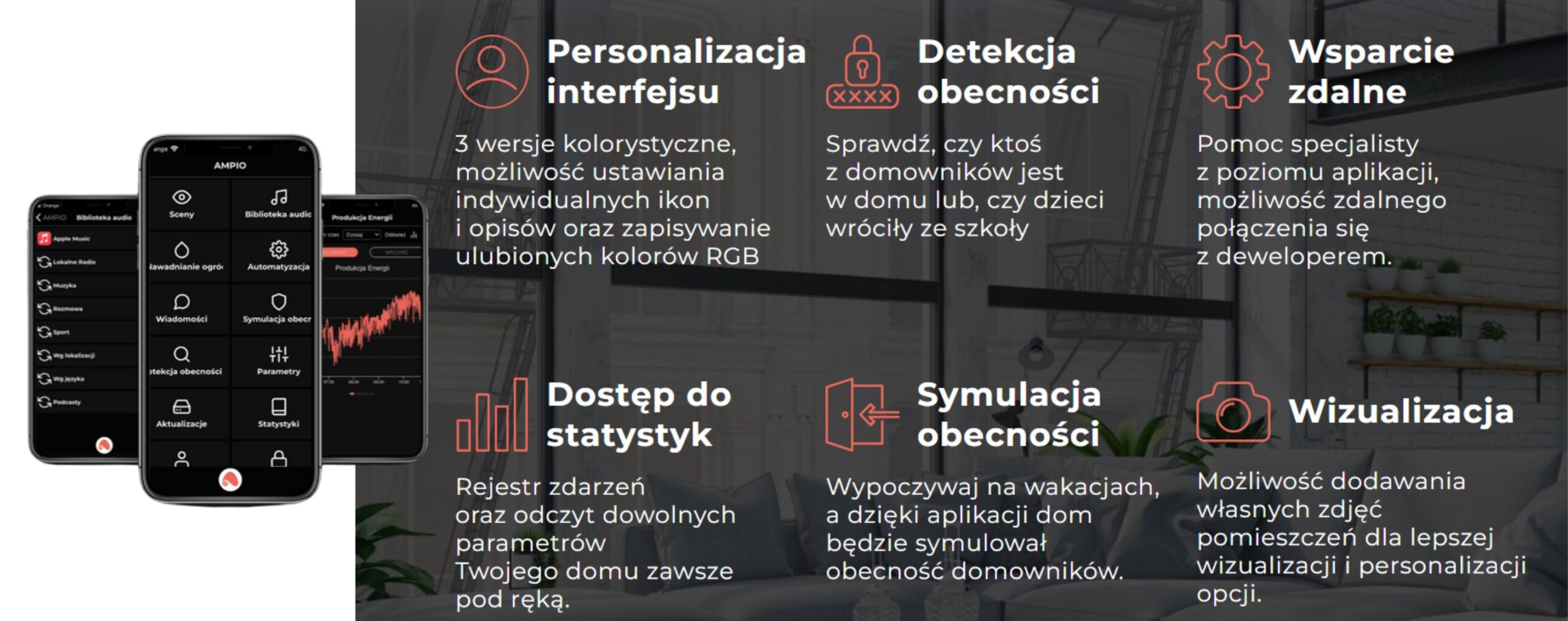 - zdalne sterowanie oświetleniem, ogrzewaniem i roletami;
